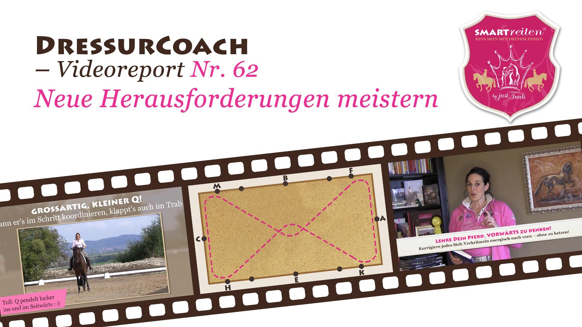 Übungen abzufragen ist relativ leicht, wenn Dein Pferd die im Übungsablauf enthaltenen Lektionen bereits beherrscht. Doch wie trainierst Du Dein Pferd in einer Übung, die für es herausfordernd ist, wenn es die geforderten Lektionen noch nicht, nur im Ansatz oder nur in einer Gangart beherrscht? Ein praktisches Beispiel, wie Du eine DressurCoach-Übung sinnvoll vor- und nachbereiten kannst, liefert dieses Training mit Tuulis Youngster Q. Dieses Video ist für jeden Reiter hilfreich, der manch eine (DressurCoach-)Übung als „noch zu schwer“ empfindet – jedes Training lässt sich auf das eigene Könnensniveau anpassen, sodass es sinnvoll zum Lernen und Wachsen beitragen kann!