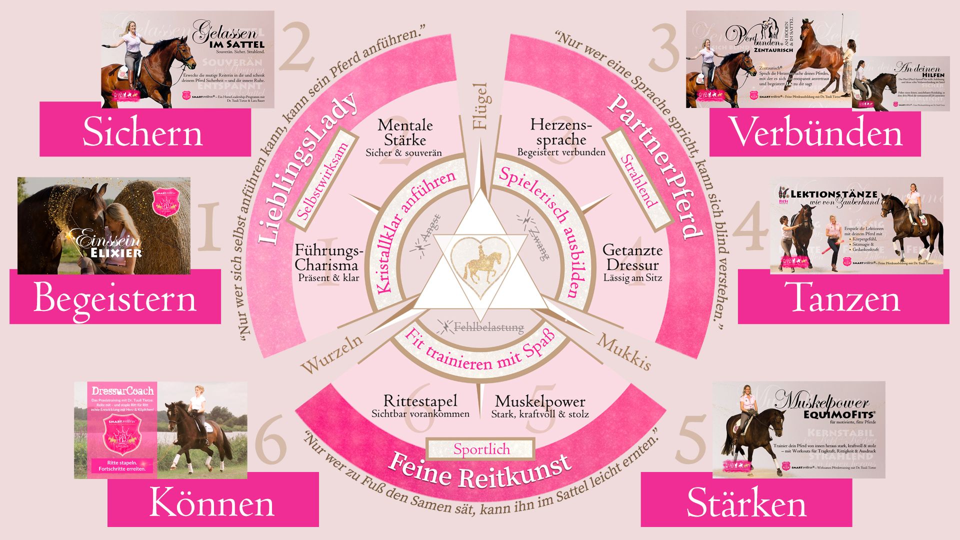 Reite durchdacht aufgebaute Trainingseinheiten – auf klaren Entwicklungspfaden. Für ein Pferd, das motiviert mitdenkt, gesunde Muskeln aufbaut und sich in Kopf und Körper mit dir entwickelt.